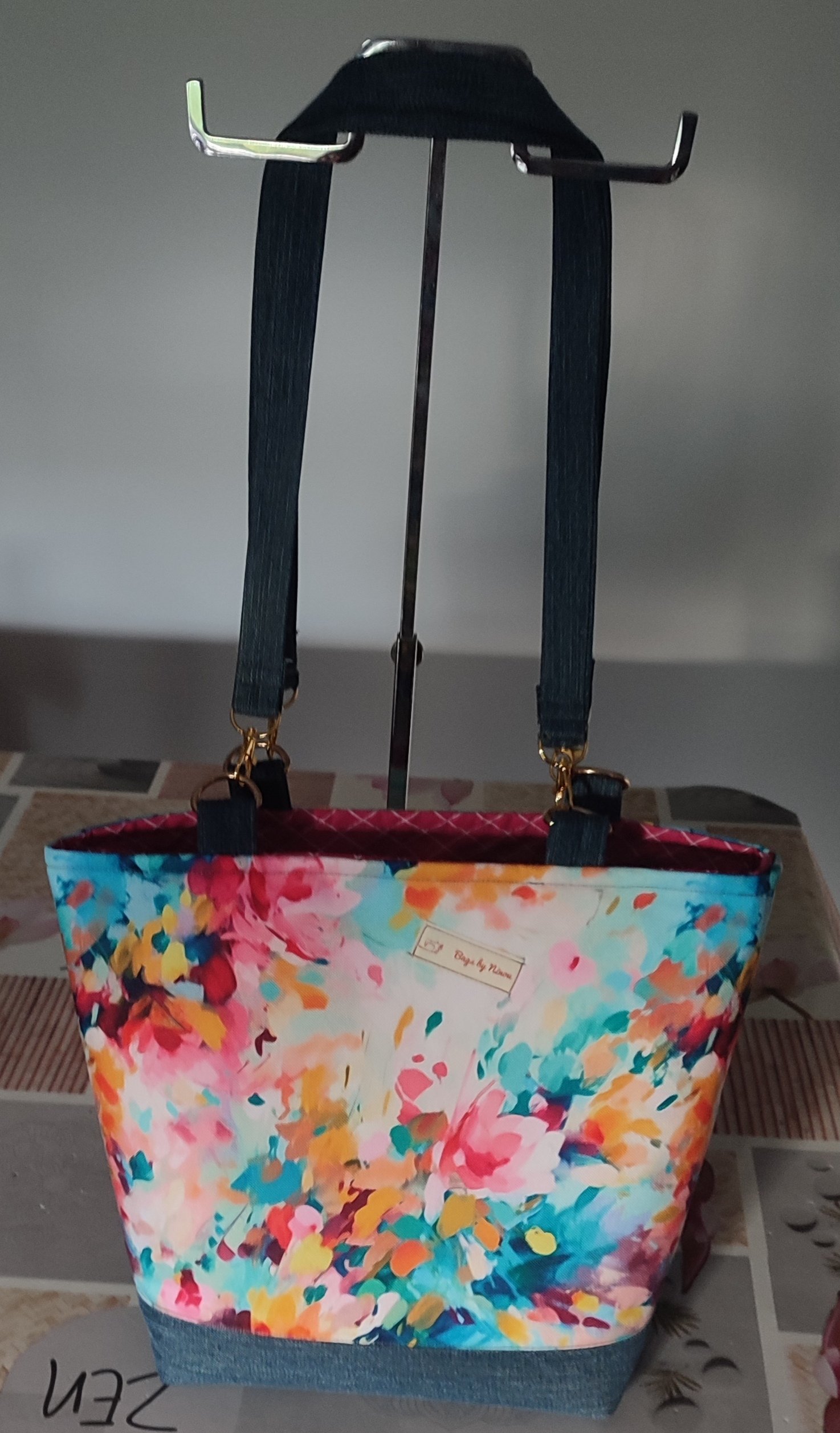 - Matières : Tissu imperméable à imprimé asiatique, jean recyclé